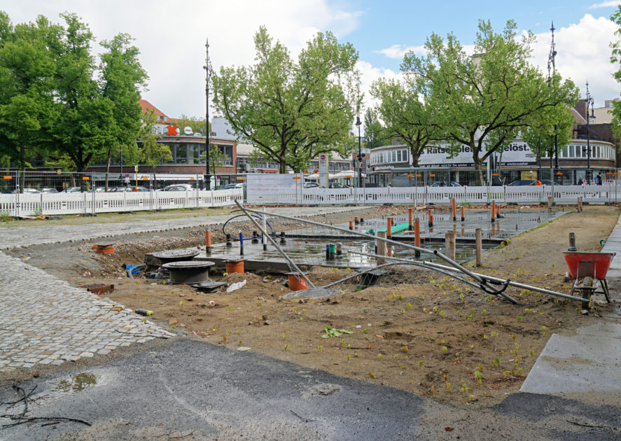 Wenn ich mal groß bin, werde ich ein Café. Seit der Neugestaltung des Lehniner Platzes am Kurfürstendamm vor zehn Jahren ist dort ein Café geplant. Zuletzt hoffte die BVG-Tochterfirma Urbanis auf eine Eröffnung in diesem Sommer, nachdem ein geplanter Termin im Spätherbst 2020 nicht eingehalten werden konnte. Doch wie man sieht, sind die Bauarbeiten noch immer nicht über das Fundament hinaus gekommen. Statt Kaffeetischen steht eine Schubkarre herum.