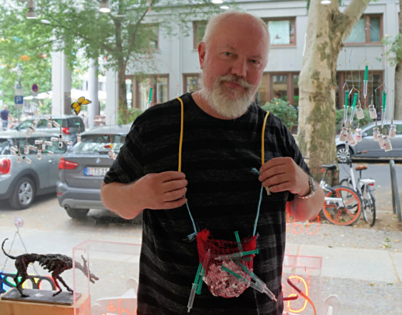 Corona-Kunstinstallation. Leere Impfampullen und Spritzen hat Gustav von Hirschheydt im Schaufenster seiner Charlottenburger Galerie an der Wielandstraße 31 aufgehängt. Der Maler, Arzt und Kunstbuchverleger wirbt so für Impfungen gegen das Coronavirus. Das Orangennetz voller Ampullen, das er sich für unser Bild umgehängt hat, soll Armut symbolisieren und verdeutlichen, dass es nicht in allen Ländern große Impfkampagnen gibt. Das Fenster zieren unter anderem auch Schmetterlingsfiguren, die der Regisseur Rosa von Praunheim dem Künstler einmal geschenkt hat.
