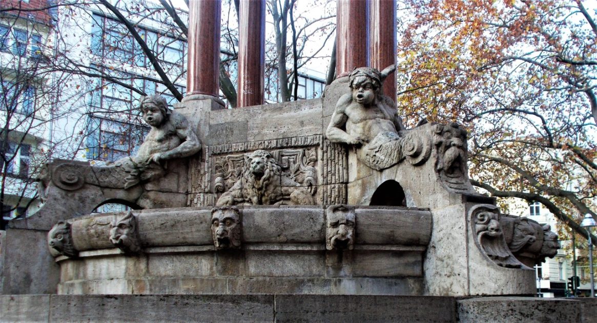 Ursprünglich war der vom Architekten Wilhelm Walther gestaltete Brunnen in den Jahren 1903 bis 1904 für das Vergnügungs-Etablissement „Bayernhof“ am Potsdamer Platz in Mitte entstanden. Deshalb ist er auch als „Bayernhof-Brunnen“ bekannt. Den Zweiten Weltkrieg überstand die Vergnügungsstätte nicht. Beim Abriss der Ruine im Jahr 1975 wurde der Brunnen zerlegt. 1980 setzte man ihn auf dem Hindemithplatz wieder zusammen. Dieser trägt seit 1995 den Namen des Komponisten Paul Hindemith.