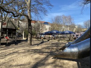 Aus für Spielplatz vor dem „Jockel“? Rutsche mit Blick auf den Landwehrkanal, Klettergerüst unter Bäumen – doch damit könnte bald Schluss sein. Der kleine Spielplatz vor dem Biergarten „Jockel“ an der Ratiborstraße 14c steht vor dem Rückbau.