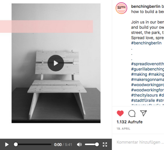 In Corona-Zeiten ist Draußen sein wichtig: frische Luft schnappen, Bewegung, das Stadtgrün genießen. Doch „nicht jede*r hat einen Balkon, deswegen haben wir ein kleines Video gemacht für alle, die sich selbst eine Bank bauen wollen“, schreibt Bella. Bänke für den Park, die Straße, den Hinterhof. Dem Team war wichtig, dass die Bänke günstig nachzubauen sind, die Materialkosten liegen bei unter 20 Euro. Genauso niedrigschwellig bleibt die Latte auch beim Werkzeug.