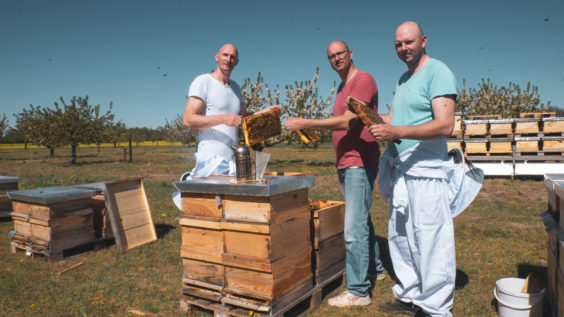 Die Imkerei „Honigprinz“, gegründet von drei Brüdern aus Rathenow: Silvio, Sven und Ronald, auf dem Foto von links nach rechts zu sehen. Der Großteil der Bienen steht im Land Brandenburg und in Mecklenburg Vorpommern. Vor ca. 5 Jahren wurde aus der Imkerei Familie Ueberschär die Honigprinz Familien-Imkerei. Silvio Ueberschär, Geschäftsführer, hat so viele Kinder wie Brüder, und zwei davon wurden im Sana Klinikum Lichtenberg geboren.