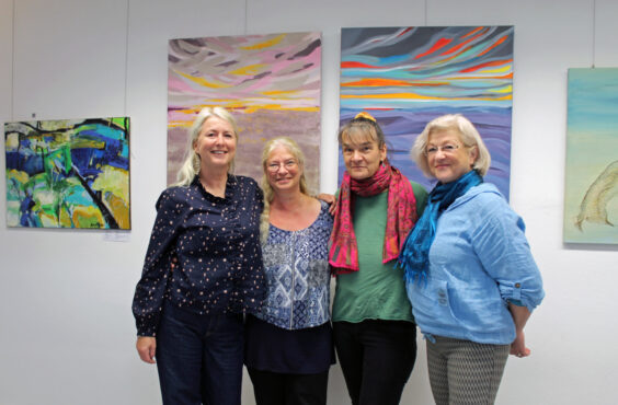 - Bild: Franka Höhne (1.v.l.), Antje Püpke (3.v.l) und Joanna Ewa Hahn (4.v.l.) stellten gemeinsam in Marzahn-Hellersdorf aus. Inés Barthel (2.v.l.) betreut die Ausstellungen in der Bezirkszentralbibliothek „Mark Twain“. Nicht auf dem Bild ist die vierte Künstlerin der Gemeinschaftsausstellung Karin Koch.