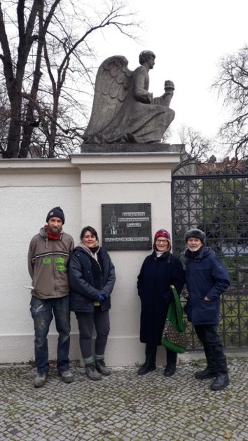 Foto: Mitarbeiter*innen des Steinmetzbetriebes Grabmale Schmidt, Ralf Abitz und Christina Mildt mit der neuen Namenstafel, Quelle: privat.