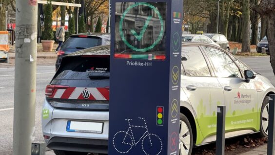 Als Vorbild dient ein entsprechendes System, das seit einem Jahr in Hamburg im Einsatz ist. In den dort aufgestellten „PrioBike“-Säulen (siehe Foto) sind Detektoren eingebaut, die Radfahrende „circa 80 bis 120 Meter vor einer Ampel erfassen und ihre Geschwindigkeit messen“. Darauf basierend werde „eine Geschwindigkeitsempfehlung errechnet, mit der die Radfahrer die aktuelle oder kommende Grünphase optimal erreichen“.