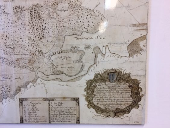 Am Hermsdorfer See begannen Vorerkundungen für die Entschlammung des Sees – siehe auch das Newsletter-Intro dazu. Dass der See in den vergangenen Jahrhunderten deutlich größer gewesen ist als heute, zeigt dieser Stich aus dem Jahre 1699, der im Reinickendorfer Museum in Alt-Hermsdorf hängt. Auf drei Seiten von Wasser umgeben ist dabei der Ortskern von Hermsdorf, unten begrenzt durch das aufgestaute Fließ. Auf der Höhe der heutigen Fließbrücke der Bundesstraße befand sich eine Wassermühle. Foto: Gerd Appenzeller