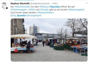 Wochenmarkt findet statt. Direkt vor dem Rathaus, zwischen U-Bahnhof und Politik-Zentrale. Stadtrat Stephan Machulik, SPD, schrieb am Mittwochmorgen: „Der Wochenmarkt vor dem Rathaus Spandau öffnet. Bis auf Toilettenpapier , Mehl und Nudeln gibt es ein buntes Warenangebot. Und immer daran denken: Abstand halten!“