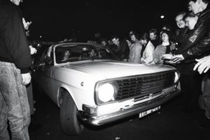Jetzt kam ein DDR-Taxi ins Spiel. Hier ein Foto von Tagesspiegel-Fotograf Kai-Uwe Heinrich, der dieses Bild 1989 machte.