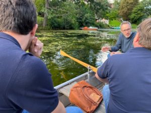 Exkursion. Am vergangenen Montag luden der BUND, der Berliner Landesverband engagiert sich im Aktionsnetz Kleingewässer, und der Verein „Umweltschutz und Landschaftspflege für den Waldsee“, kurz Waldseeverein, zum Dialog und zur Bootspartie. Verteilt auf acht Ruderboote der Seeanlieger stieß die Armada aus Verwaltungsbeschäftigten, Bezirksverordneten, Abgeordneten, Presseleuten, Umweltschützern, Anwohnenden und neugierigen Bürgerinnen und Bürgern auf den künstlich angelegten See vor, um sich ein eigenes Bild vom Idyll über der Oberfläche und dem schlammigen Grauen darunter zu machen. Nach der Expedition kamen die etwa 70 Teilnehmenden im Garten des Haus der Jugend zusammen, um vor allem eines zu besprechen: Wie der Waldsee wieder aufgepäppelt werden kann.