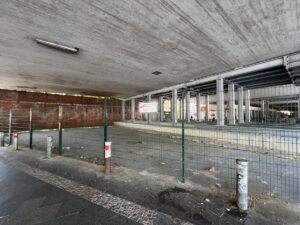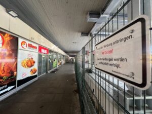 Die grünen Zäune, die massiven Stützen, die immer leerer werdende Ladenzeile – die Tristesse unter der Brücke wird bleiben und zunehmen. Hinzukommt noch die Verwahrlosung, der Müll entlang der Wege zum S-Bahnhof. Die Autobahn-Firma habe ein Reinigungsunternehmen beauftragt, das einmal in der Woche das Areal vom Müll befreie. „Die Firma erfüllt die vertraglichen Verpflichtungen zur Zufriedenheit“, lautet das offizielle Statement. Die Beobachtung zeigt: Wöchentlich reicht nicht aus. „Leider wird durch Passanten ständig Unrat über die Stabmattenzäune geworfen“, konstatiert Ralph Brodel.