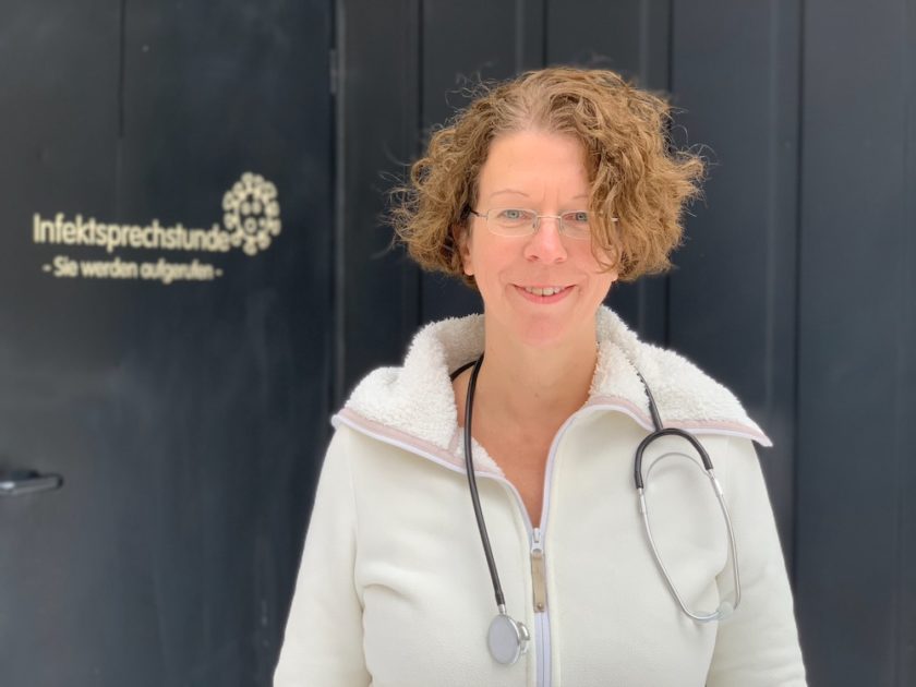 Hausärztinnen und Hausärzte haben in der Markelstraße 61 schon fast zwanzig Jahre ihren Sitz. Doch erst seit der Pandemie steht im Hof des Hauses ein schwarzer Container. Wer den Verdacht hat, an einer Infektion erkrankt zu sein, wird dort behandelt. Seit 2010 praktiziert Ärztin Veronika Rufer, 50, in Zehlendorf aufgewachsen, in der „Hausarztpraxis Steglitz“. Vier Ärztinnen und Ärzten betreiben die Praxis, gemeinsam haben sie sie zu einer Corona-Schwerpunktpraxis weiterentwickelt.