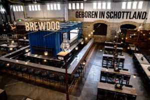 Durch die Glaswand können die Gäste weiter in die Brauerei mit den Kesseln schauen, in denen zurzeit weiter vor allem Bier von Stone Brewing gebaut wird, später wird dort auch das Bier von Brewdog – beispielsweise das Punk IPA – hergestellt werden. Aus den Hähnen fließen rund 60 verschiedene Biersorten – von Brewdog selber, aber auch von anderen Craft-Beer-Brauereien. Die Küche bietet unter anderem Pizza, Burger, Wings – ebenfalls in vegetarischen und veganen Varianten.