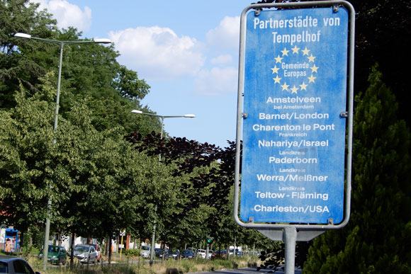 Der Bezirk und seine Partnerstädte. Tempelhof-Schöneberg hat 14 aktive nationale und internationale Städtepartnerschaften: Ahlen, Amstelveen, Bad Kreuznach, London Borough of Barnet, Charenton-le-Pont, Koszalin, Levallois-Perret, Mezitli, Nahariya, Paderborn, Penzberg, Teltow-Fläming, Werra-Meißner-Kreis und Wuppertal. Die Zahl ist so hoch, weil vor der Bezirksfusion im Jahr 2001 Tempelhof und Schöneberg eigenständige Bezirke waren und entsprechend eigene Partnerschaften pflegten. In Tempelhof machten blaue Schilder auf die Partner aufmerksam, wie dieses Foto der Seniorenvertretung zeigt; in Schöneberg sind auf weißen Schildern die Wappen der Partnerstädte abgebildet.