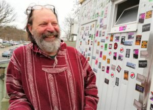 Minimalismus im Alltag. So ist es bei Ebay-Kleinanzeigen zu lesen, In die Container, die am S-Bahnhof Grünau stehen (weitere angeblich in Schöneweide und Karlshorst), passen ein Bett, ein Kühlschrank, ein Regal. Ein Schrank würde die Bewegungsfreiheit schon ziemlich einschränken. Frank Biesendorfer, US-Amerikaner mit deutschen Wurzeln (siehe Foto), 58 Jahre, wohnt hier seit fünf Monaten und ist ganz zufrieden. Er mag den „Minimalismus“, in der Kunst und auch für seinen privaten Alltag. Nach einer Scheidung habe er seinen Besitz in den USA verkauft und lebe seitdem im Container in Grünau. Die Wände des Containers hat er mit Zeitungsseiten beklebt, die er wild bemalt hat. Eigentlich sei er Filmemacher, habe aber schon lange keinen Film mehr gemacht. In Berlin arbeitet er als Koch, auch Lkw habe er schon gefahren. Als US-Bürger sei er daran gewöhnt, sich alleine durchzuschlagen und nicht auf den Staat zu warten.